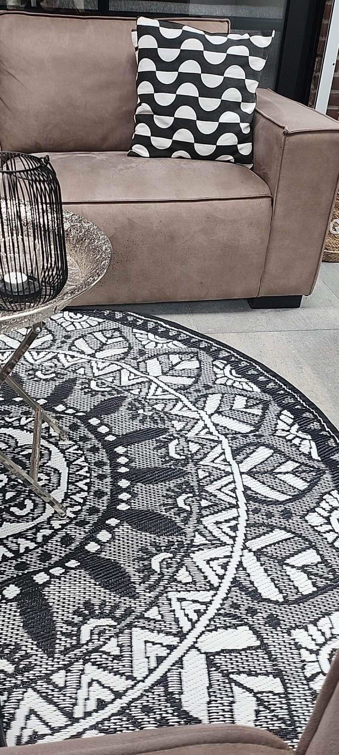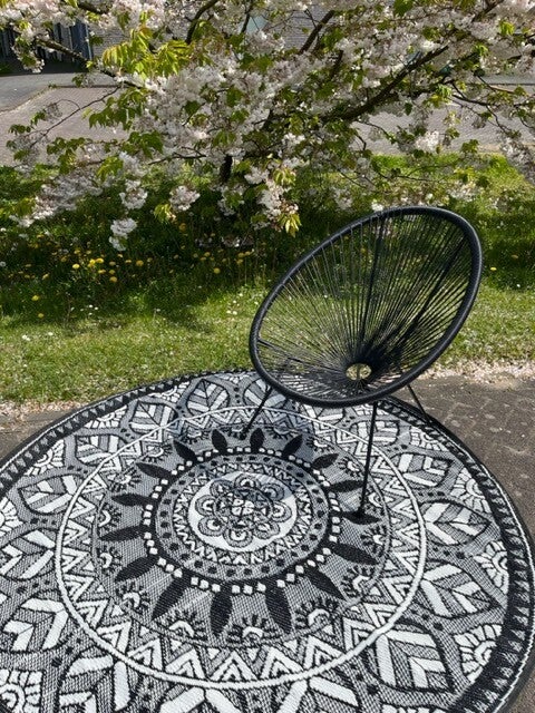 Buitenkleed rond 175cm, zwart/wit, mandala