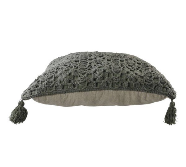 Dit woon kussen in army kleur voelt zich thuis op zowel de vloer als op de bank. Met de 60x60cm afmeting is het kussen groot genoeg om lekker in weg te loungen. De bovenkant is gehaakt en de kwastjes aan de punten geven er een bohemian look en feel aan.