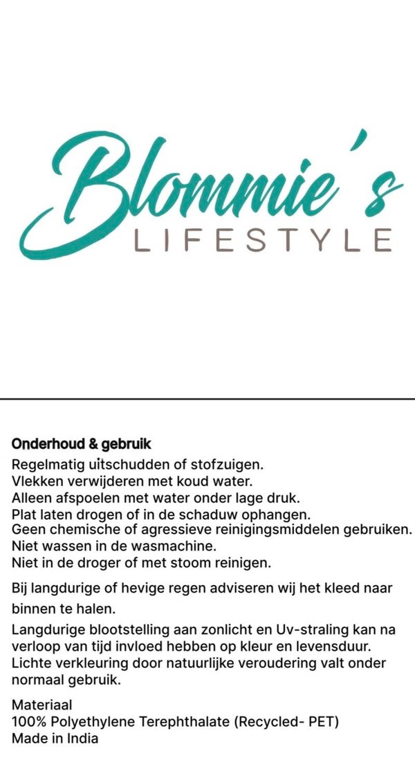 Langdurige blootstelling aan de felle zon en wind kan de levensduur van het vloerkleed beïnvloeden. Indien geen overkapping adviseren wij het kleed in de winter binnen te halen.