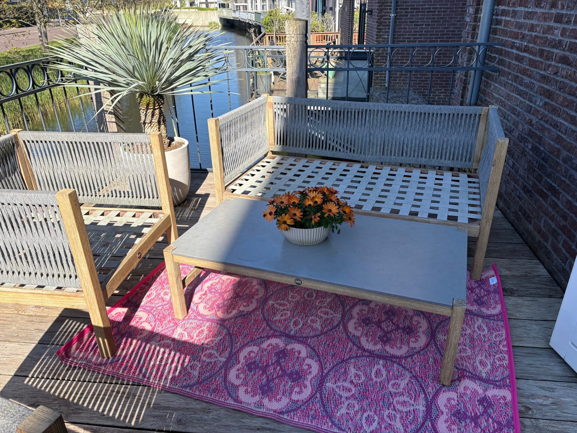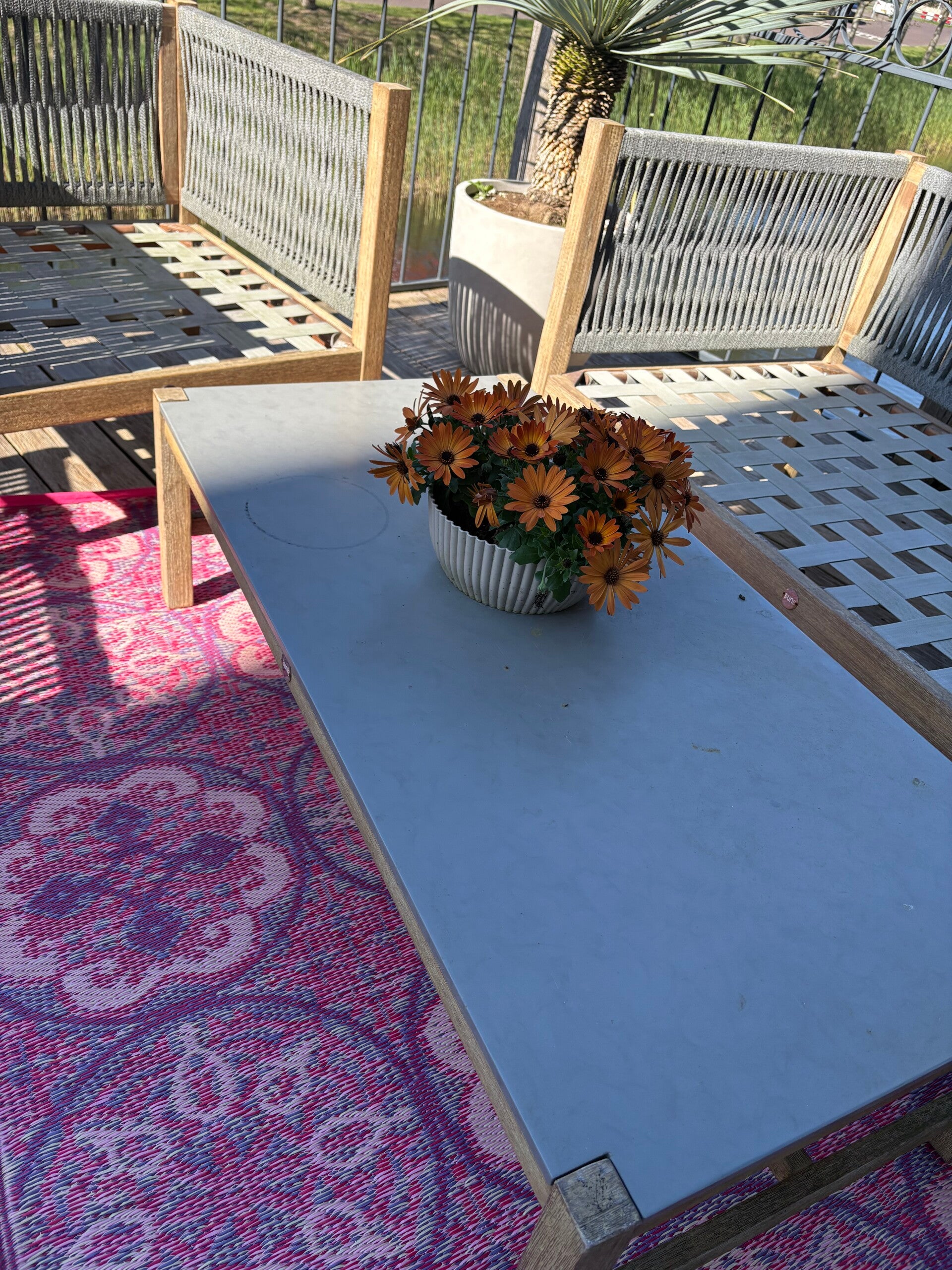Langdurige blootstelling aan de felle zon en wind kan de levensduur van het vloerkleed beïnvloeden. Indien geen overkapping adviseren wij het kleed in de winter binnen te halen.